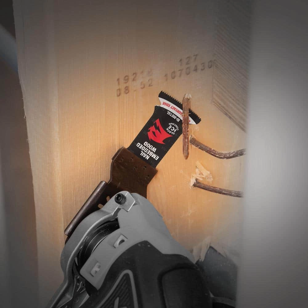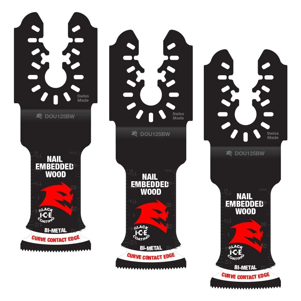 DIABLO’s universal fit bi-metal oscillating blades feature application specific designs that deliver maximum durability and longer life in nail-embedded wood applications. These high-performance blades feature an ultra-hardened cutting edge to deliver up to 5X longer life than standard blades. Curve contact edge creates a pilot for precise, clean plunge cuts with less vibration. Black I.C.E. (Industrial Cooling Element) keeps the teeth cool and build up free for fast, clean cuts. The blade’s universal fit, adapter-free design easily attaches most tools, with the exception of Starlock tools.