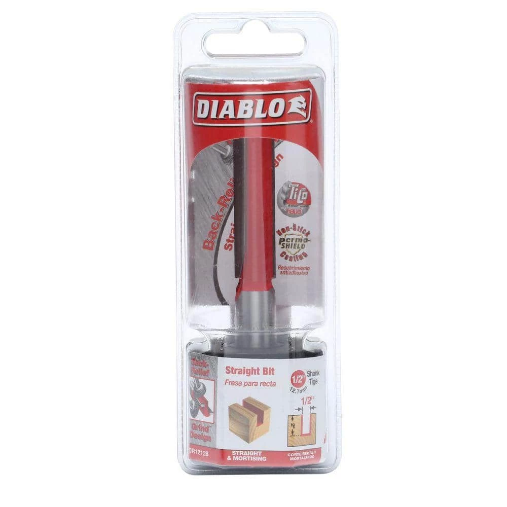Fashioned with unique back-relief grind, the Diablo 1/2 in. x 2 in. Carbide Straight Router Bit delivers superb chip clearance resulting in limited heat buildup to produce controlled, balanced cuts. Its high-density carbide and titanium composition is designed to tackle heavy-duty jobs, with impacts and vibrations kept to a minimum thanks to tri-metal brazing.