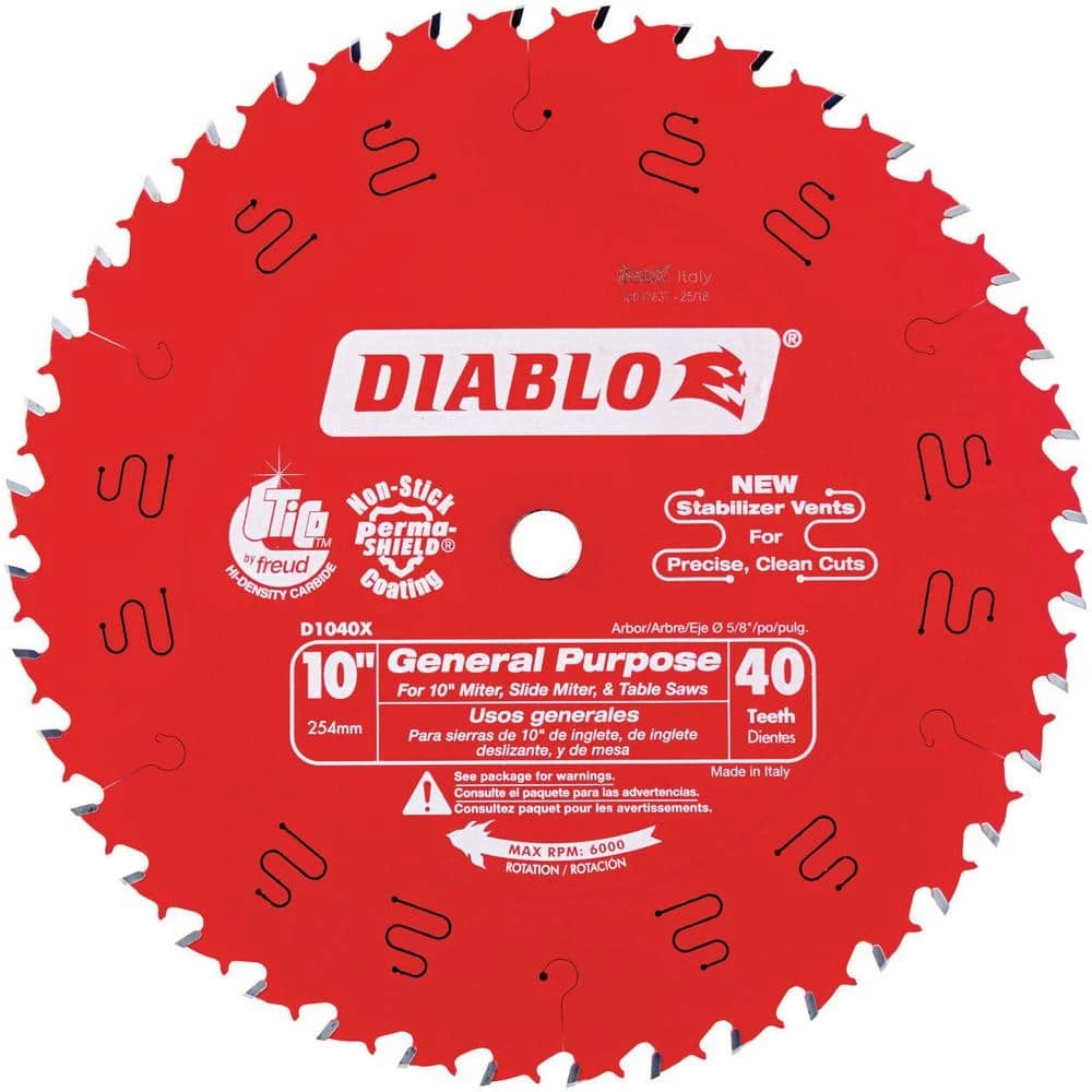 Make sharp, accurate cuts with the Diablo 10 in. x 40-Tooth General Purpose Saw Blade. It’s ideal for oak, pine, plywood, pressure-treated lumber and beams. This blade was made of durable TiCo high-density carbide for long-lasting performance. The Perma-SHIELD non-stick coating protects the blade from heat, gumming and corrosion.