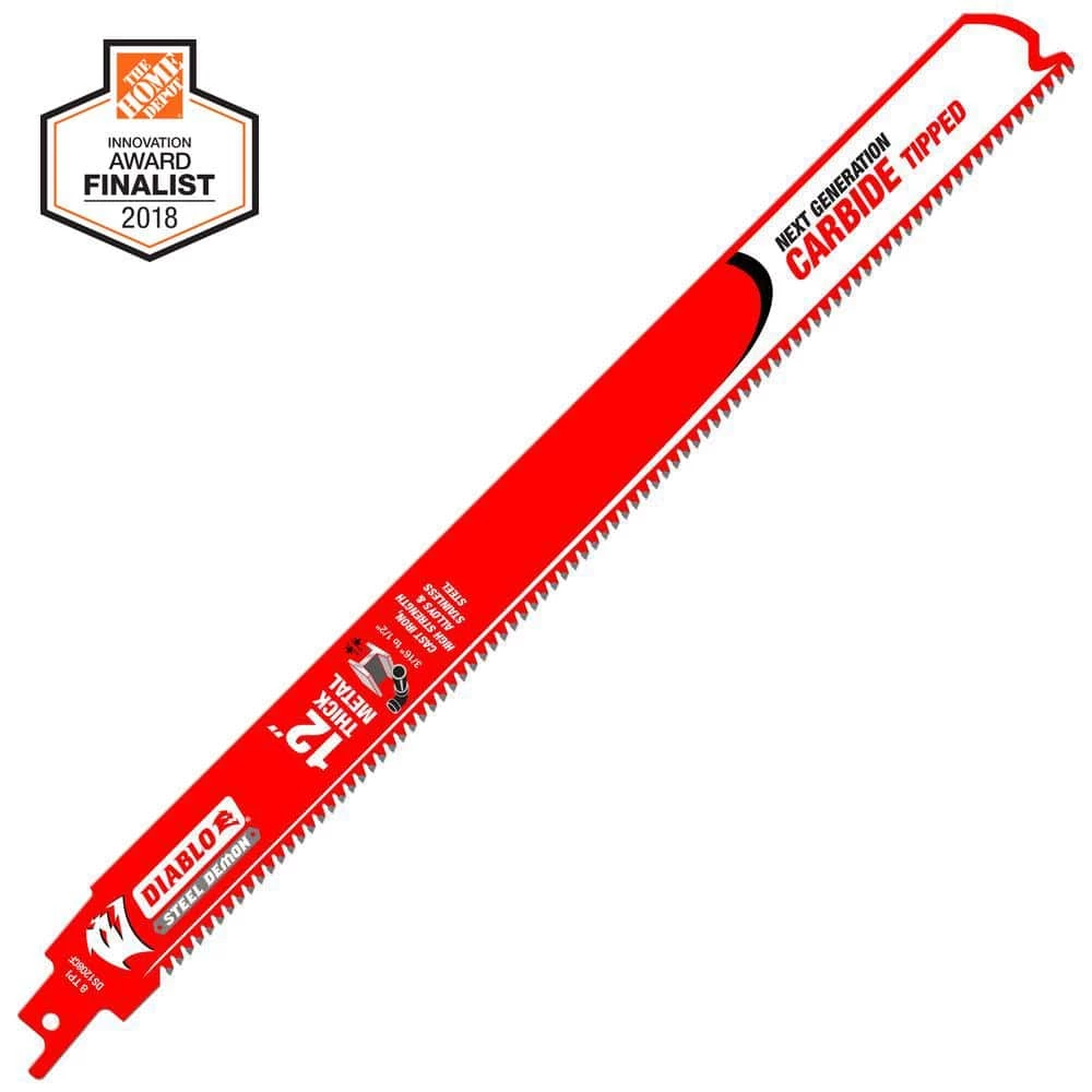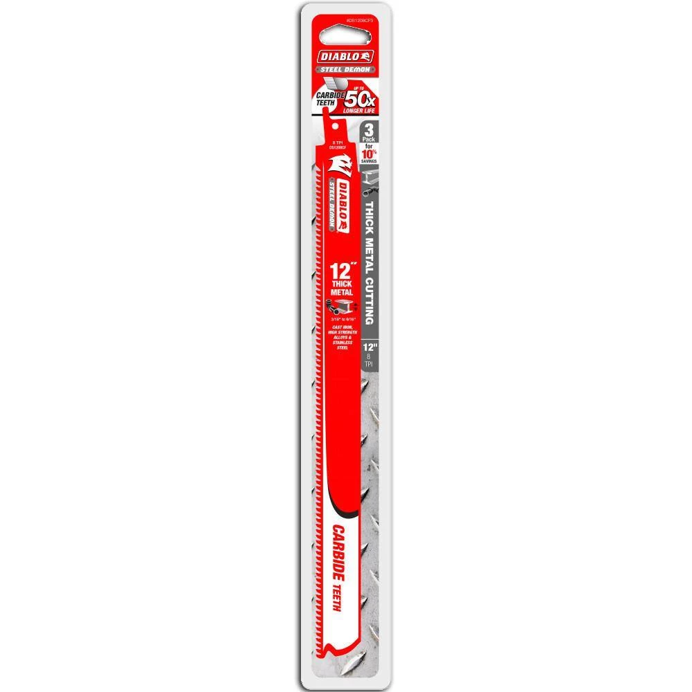 The Diablo Steel Demon Carbide-tipped reciprocating blades are the first carbide-tipped blades designed for extreme metal cutting; including high strength alloys, cast iron and stainless steel. This high performance carbide-tipped blade delivers unmatched 50 times longer cutting life than standard bi-metal blades in extreme thick metal cutting applications between 3/16 in. to 1/2 in. The increased blade body height produces straighter cuts with less vibration. Up to 10% savings when purchasing this 3-piece pack.