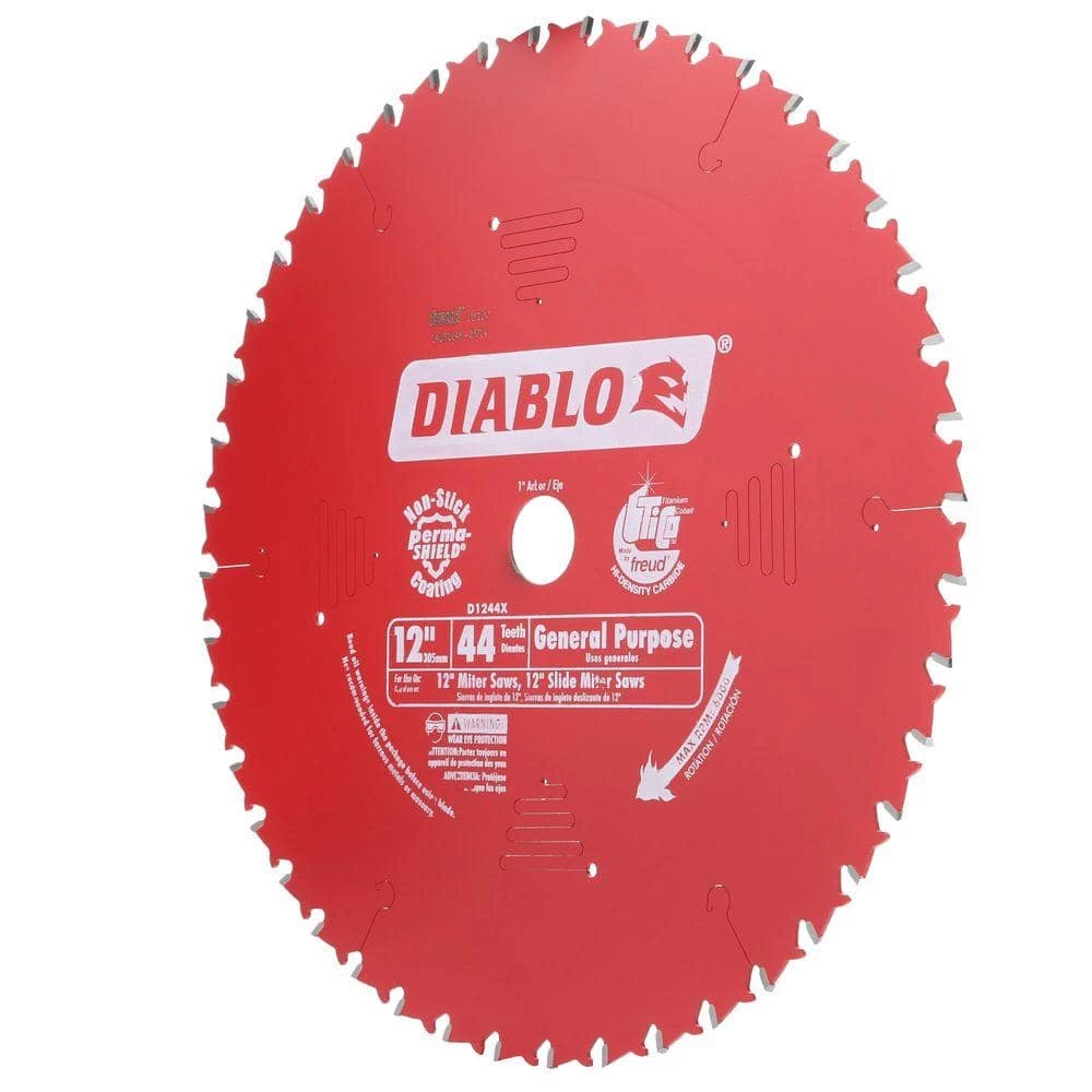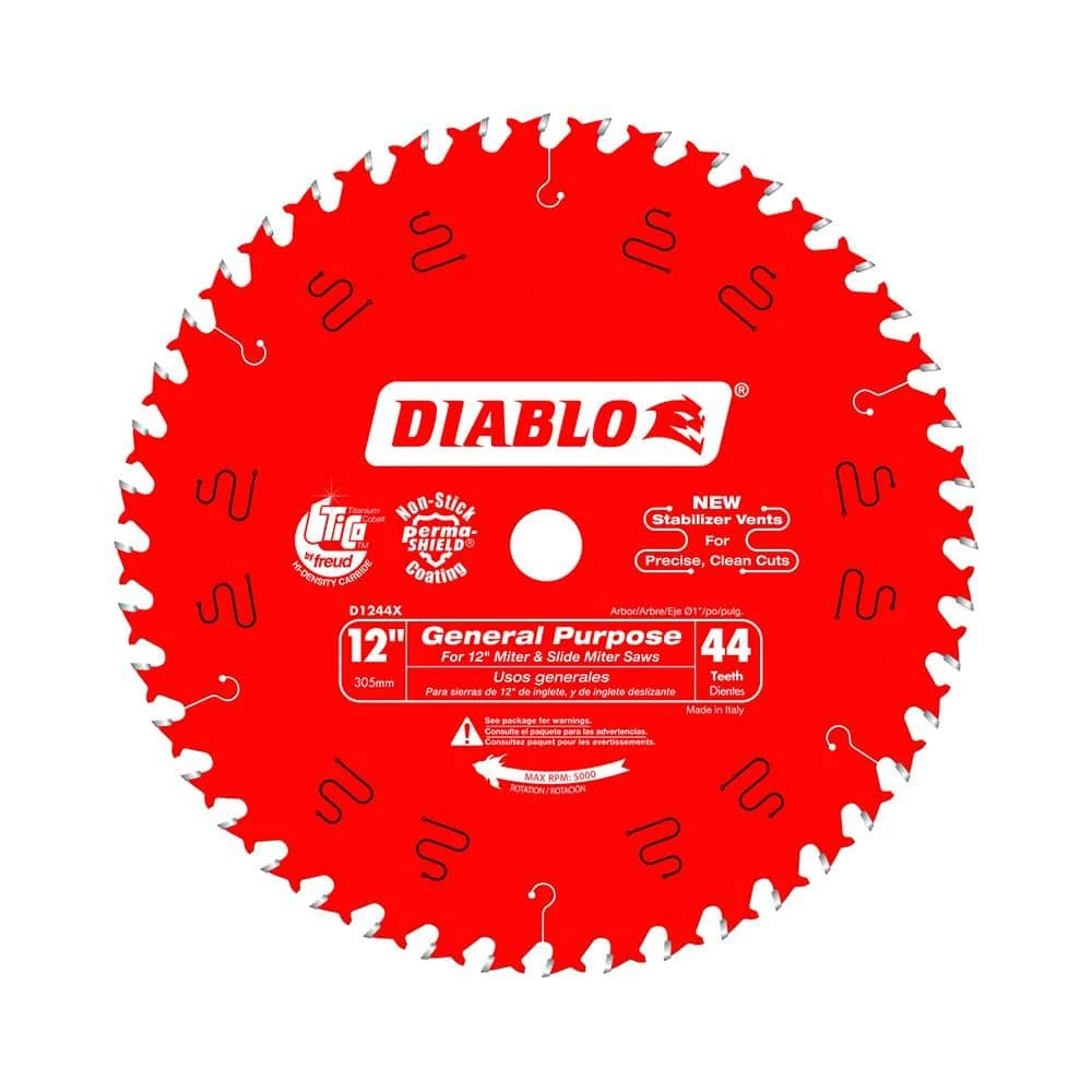 Diablo’s next generation 12 in. x 44 Tooth General Purpose Carbide Circular Saw Blade features new laser-cut stabilizer vents for precise and clean cuts in a variety of wood materials. The advanced stabilizer vents feature a permanent filler baked in from top to bottom for absorbing noise and preventing sideways movement, allowing the blade to slice through wood cleanly, quickly and accurately. Constructed with TiCo Hi-Density special-blend carbide, Diablo’s 12 in. general purpose blade produces razor sharp cuts and provides 5X longer cutting life. The laser cut heat expansion slots allow the blade to expand and contract during use, keeping the cut true and straight. This blade is excellent when working on projects such as decking, framing and building furniture.
