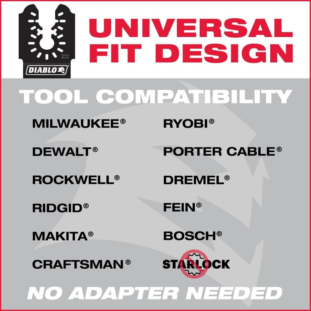 DIABLO’s universal fit bi-metal oscillating blades feature application specific designs that deliver maximum durability and longer life in nail-embedded wood applications. These high-performance blades feature an ultra-hardened cutting edge to deliver up to 5X longer life than standard blades. Curve contact edge creates a pilot for precise, clean plunge cuts with less vibration. Black I.C.E. (Industrial Cooling Element) keeps the teeth cool and build up free for fast, clean cuts. The blade’s universal fit, adapter-free design easily attaches most tools, with the exception of Starlock tools.