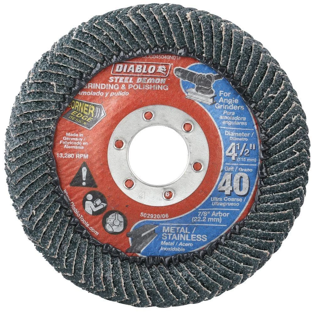 The Diablo Steel Demon 4-1/2 in. 40-Grit (ultra coarse) Flap Disc simultaneously grinds and polishes with an innovative rounded edge design that cushions the action for ease of use and precise material removal. Affix this durable wheel to an angle grinder to produce smooth, polished surfaces on metal and stainless steel without it digging into the workpiece or spraying shrapnel everywhere.