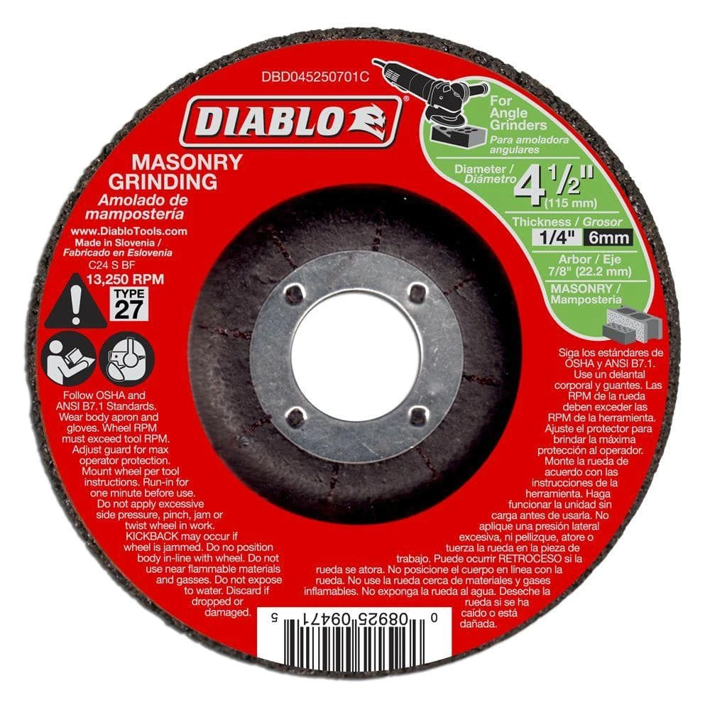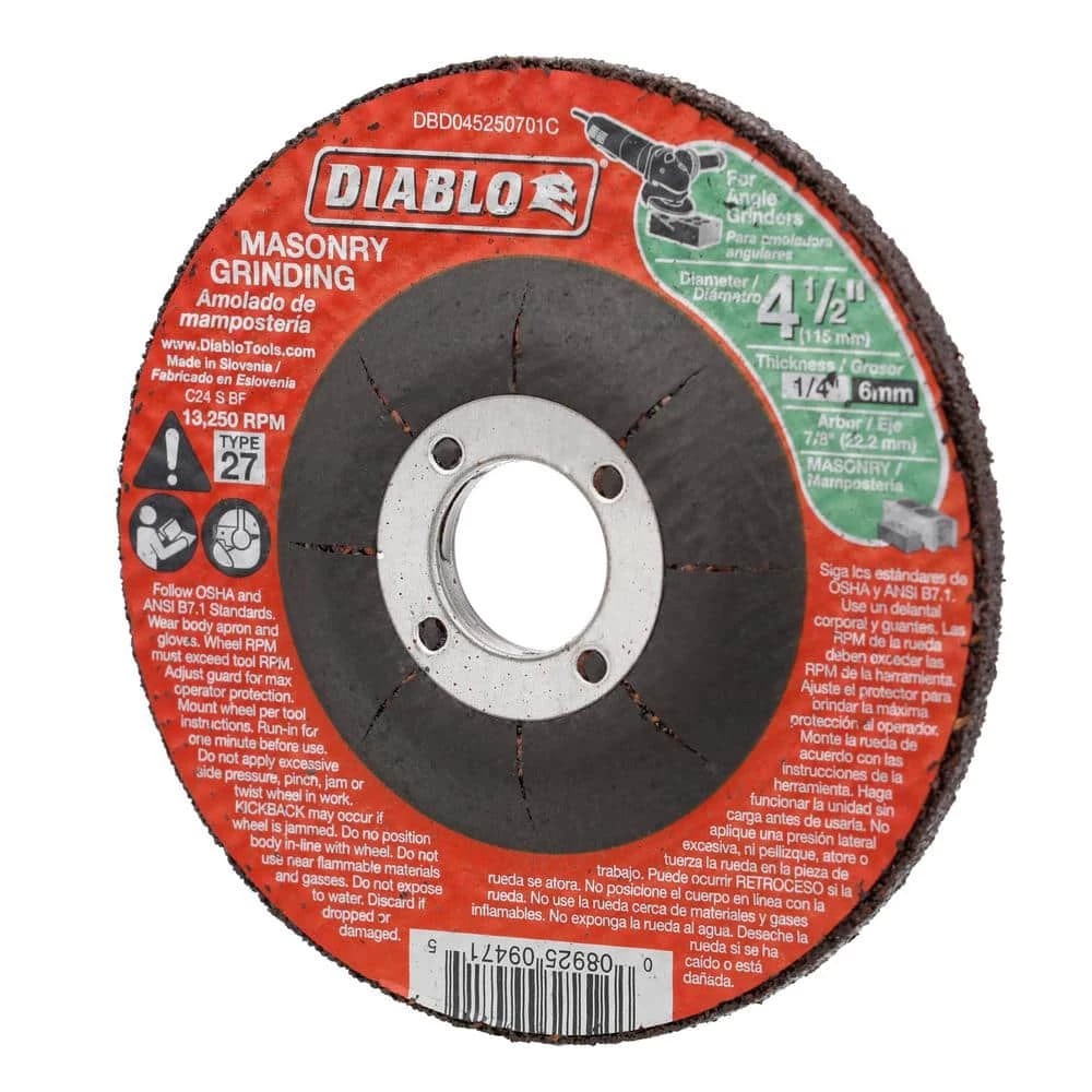 Diablo’s premium masonry grinding disc provides superior performance and increased productivity. Featuring a premium silicon carbide blend, the disc quickly grinds through material and offers an extra-long grinding life. Fully reinforced for hand-held grinding work, it is ideal for working in hard-to-reach areas.