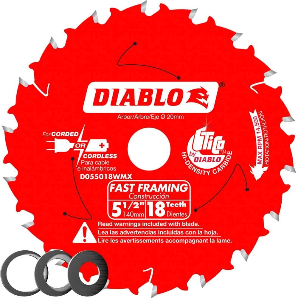 Diablos fast framing saw blades produce accurate, smooth cuts on framing materials without bogging down your cordless saws battery. This 20 mm arbor saw blade includes 3 additional bushings that allow your blade to also fit on 1/2 in., 5/8 in. or 10 mm arbor saws. These blades feature Diablo made TiCo Hi-Density Carbide engineered exclusively to maximize life, performance and durability in wood cutting applications. The thin kerf body minimizes material removal and requires less cutting power, delivering fast, clean rips and cuts.