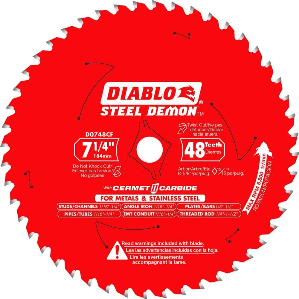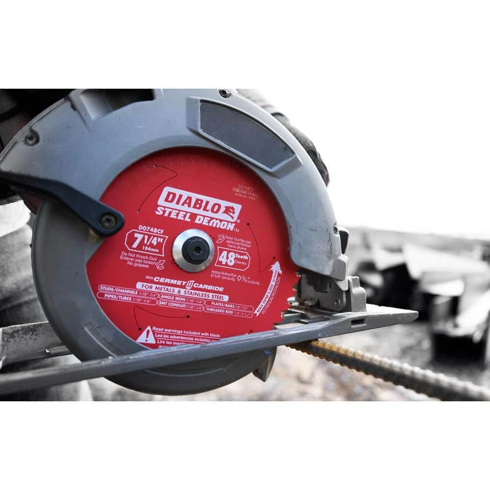 DIABLOs new Steel Demon Cermet saw blade series is redefining metal cutting and the jobsite, by introducing safer, exclusive innovation that allows users to cut both mild and stainless steels for up to 40X longer life versus standard carbide-tipped metal cutting saw blades. The specially formulated Cermet (Ceramic and Metallic blend) teeth provide high heat tolerances and increased hardness for superior wear and ultimate cutting life. Featuring a special Triple Chip Grind and Perma-Shield coating, these blades slice through the toughest of metals to produce precise cuts and burr-free finishes that require no rework. The thin-kerf body and advanced laser cut anti-vibration stabilizer vents reduce vibration and noise to allow the blades to quickly shear through metal with ease and accuracy. The ability to cut through both mild and stainless steel eliminates the need for individually dedicated saw blades, offering a 1-blade solution for ultimate metal cutting performance and unmatched value story, forever changing the metal cutting industry.